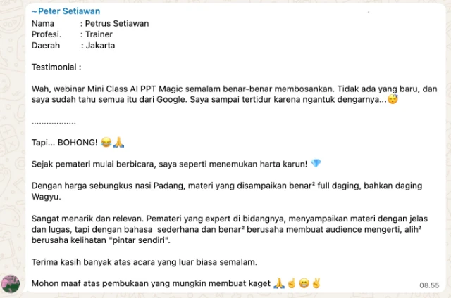 Saya ajarin di webinar MINI CLASS AI Presentation Magic—lengkap dengan live demo.